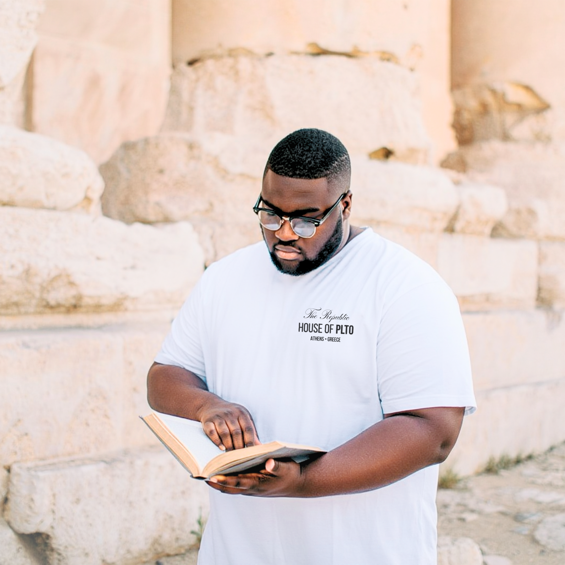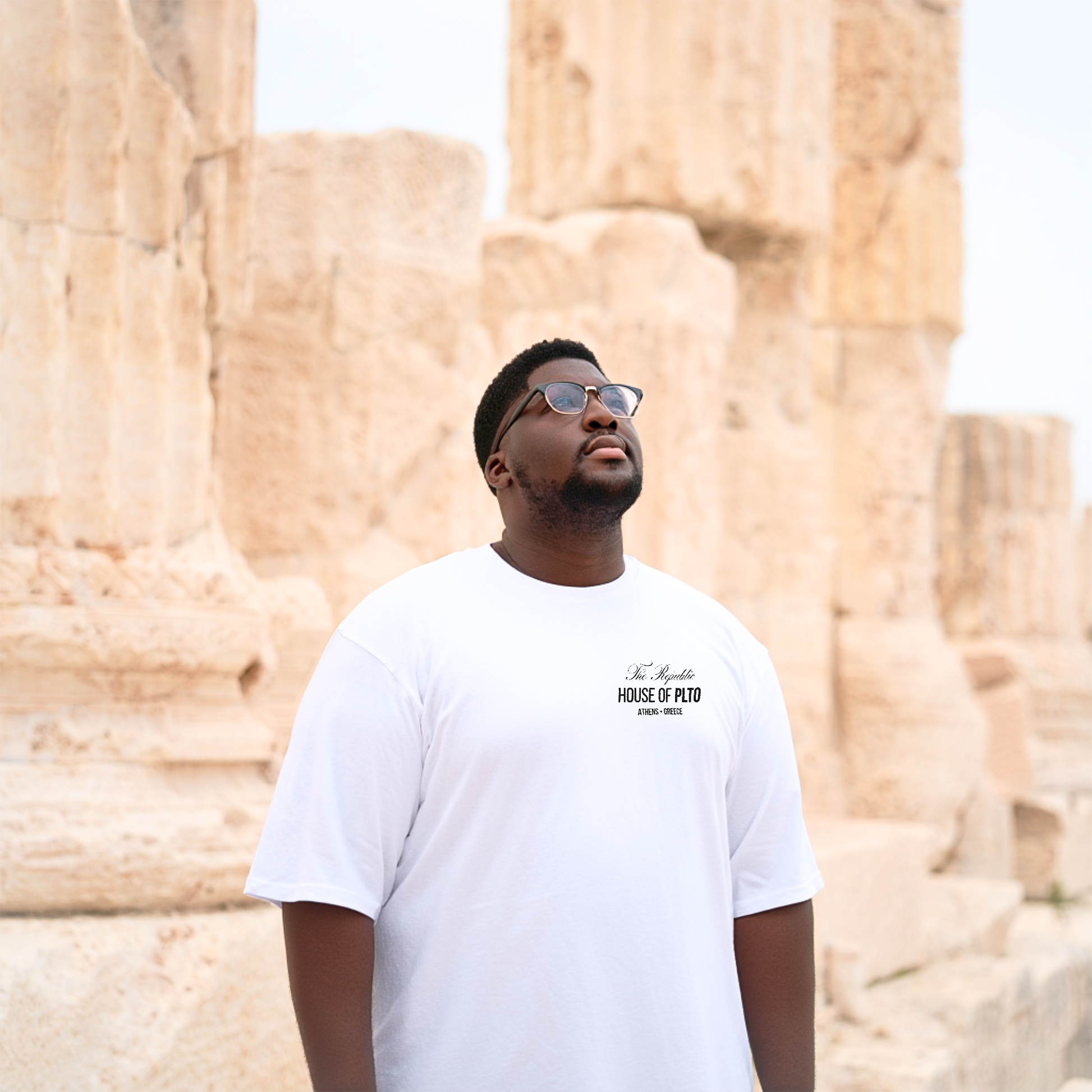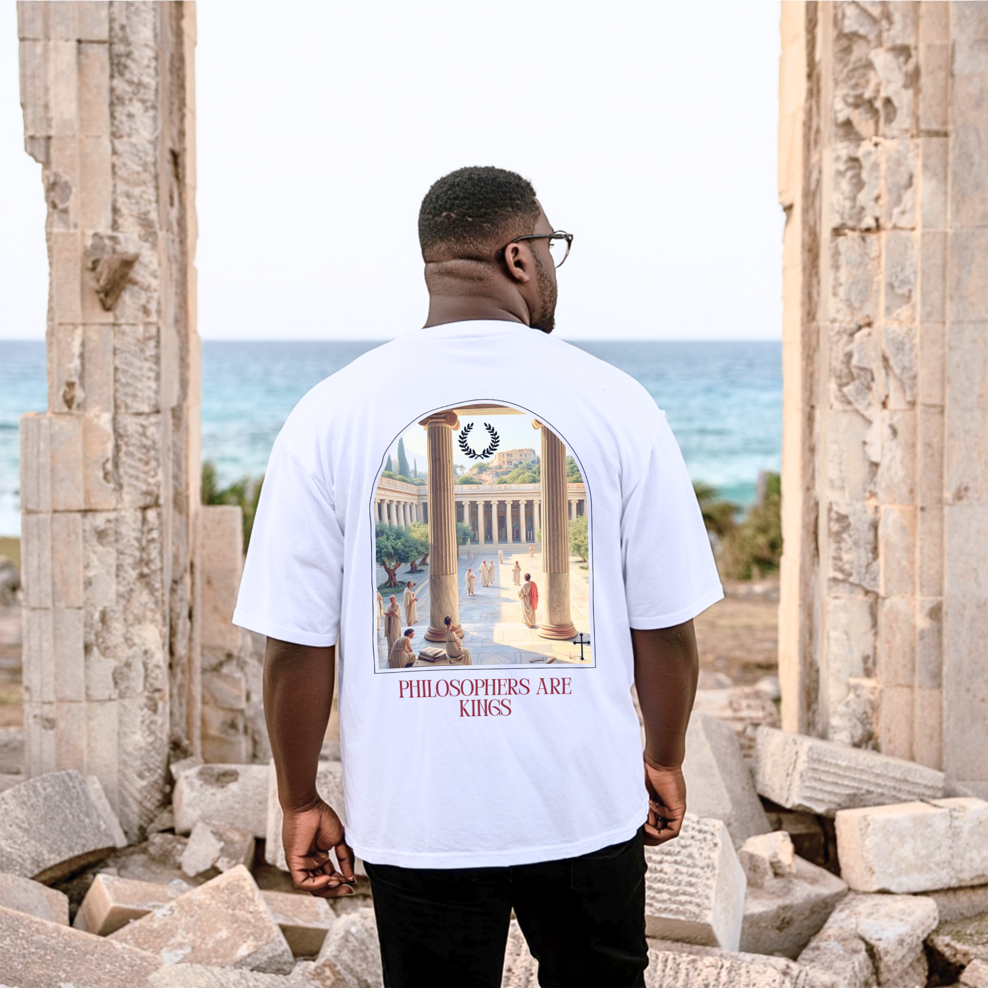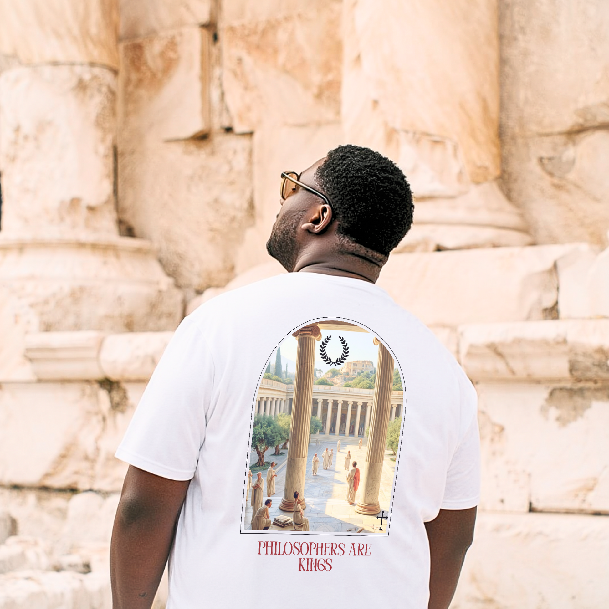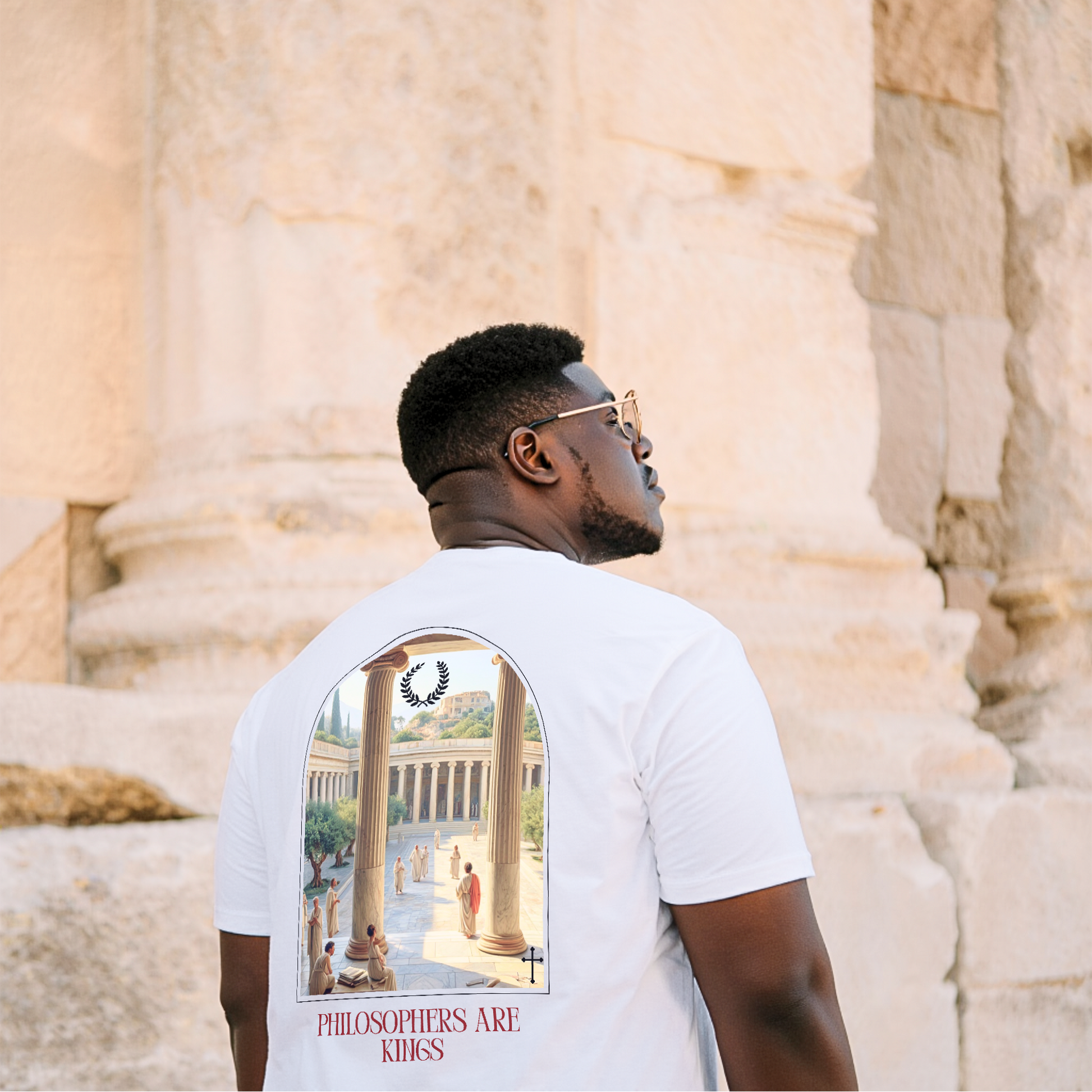 The Agora Tee frames a sunlit scene of ancient discourse — a courtyard alive with scholars, debate, and the pursuit of truth. Set beneath the archway, this illustration honours the Greek marketplace of ideas, where philosophy shaped civilisation and men sharpened themselves through dialogue.