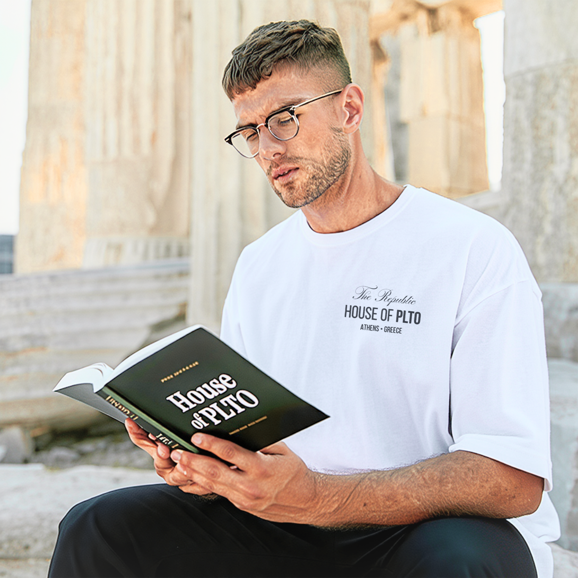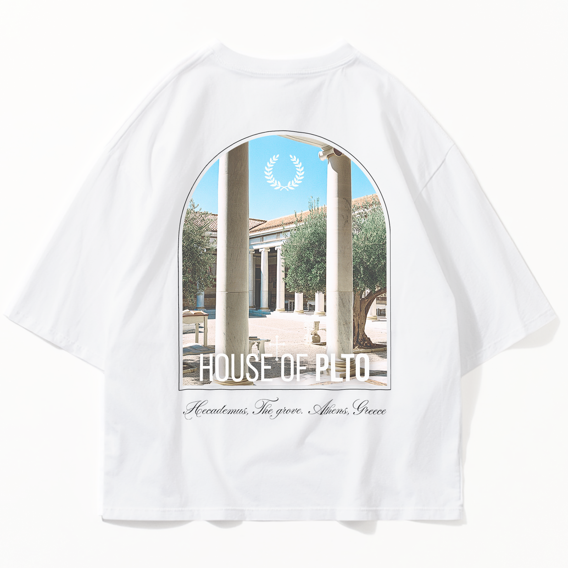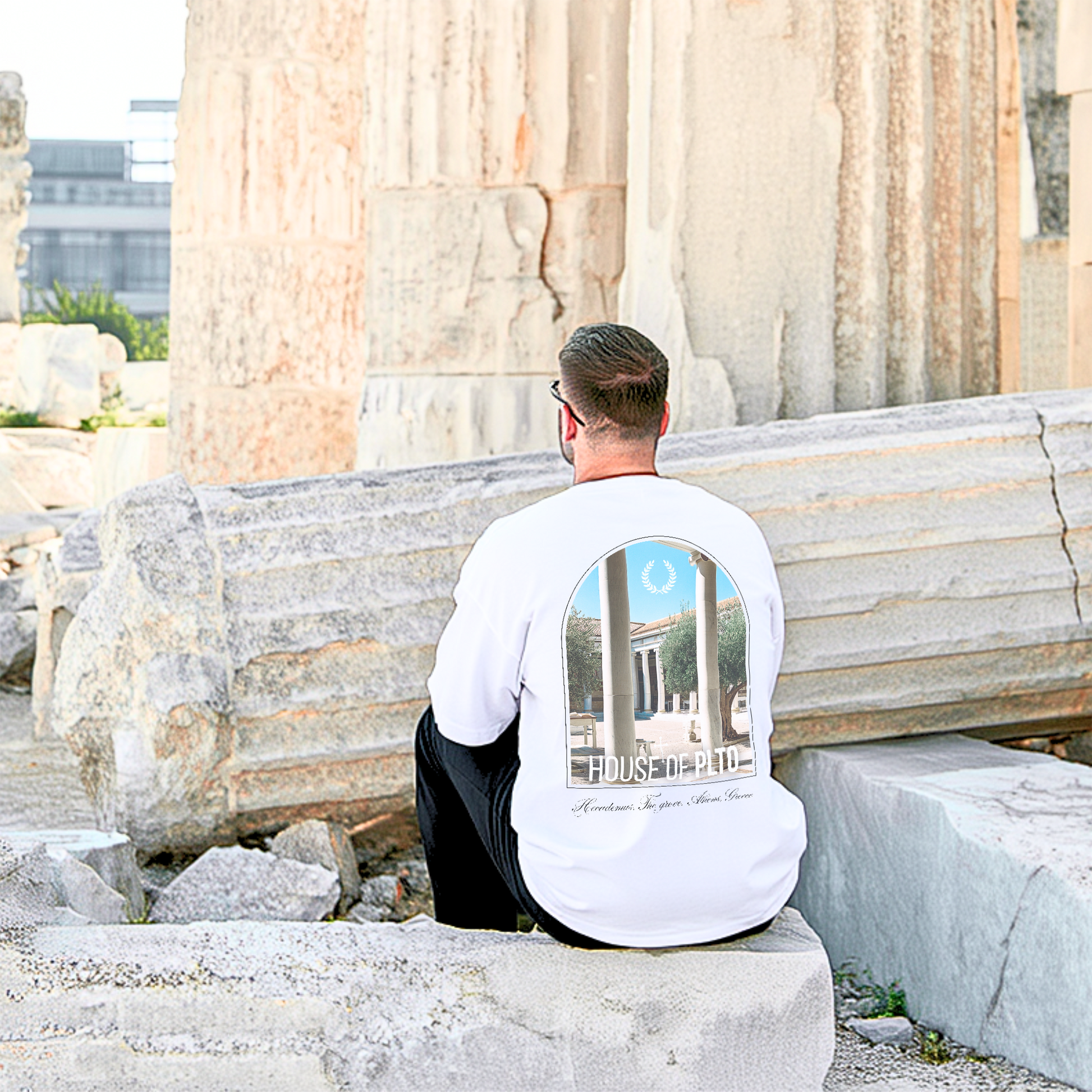 The Forum Tee captures a quiet corner of Hecademus — a colonnade standing in stillness beneath the Athenian sun. Olive branches frame the path forward, symbolising clarity, wisdom and the grounding of a man who walks with intention.