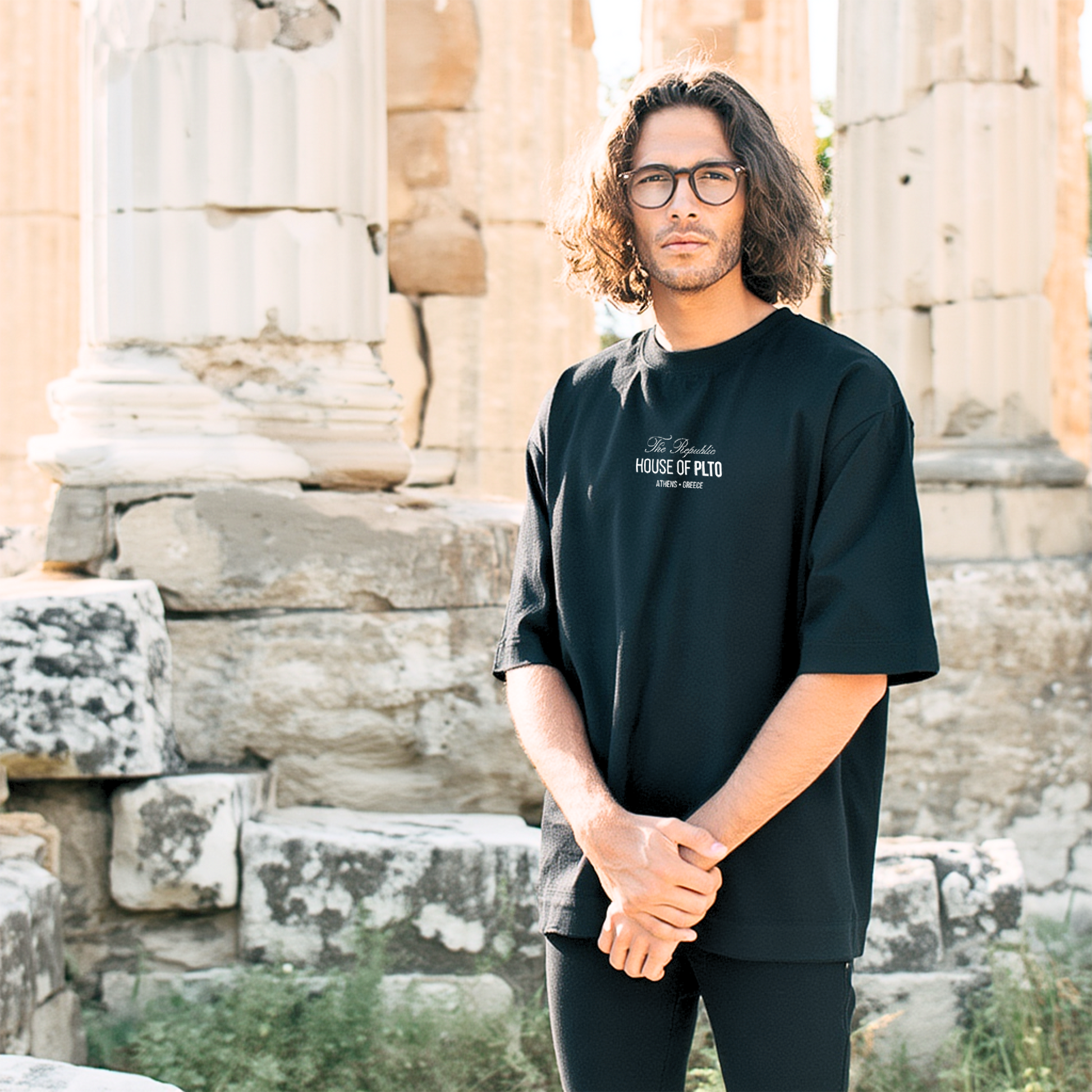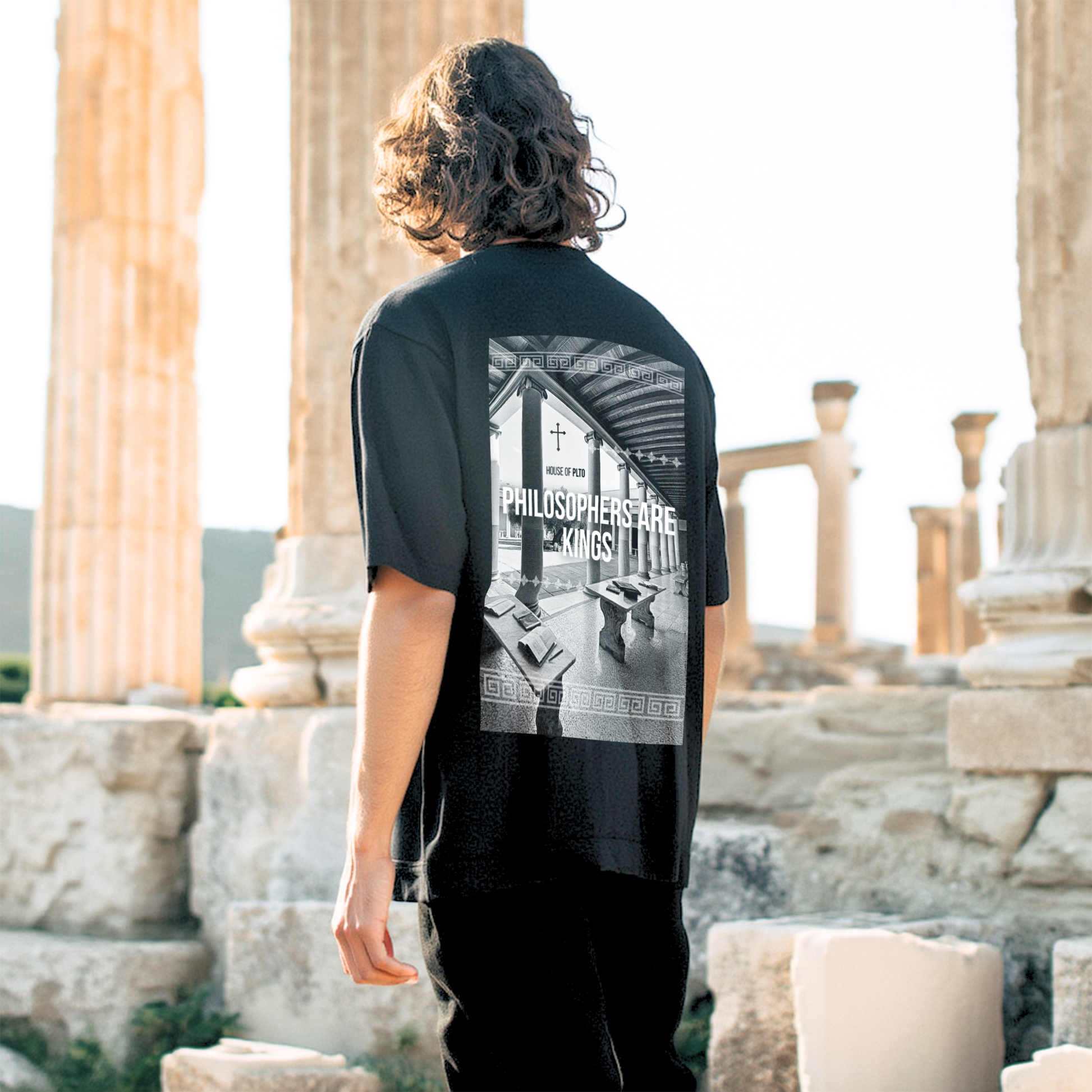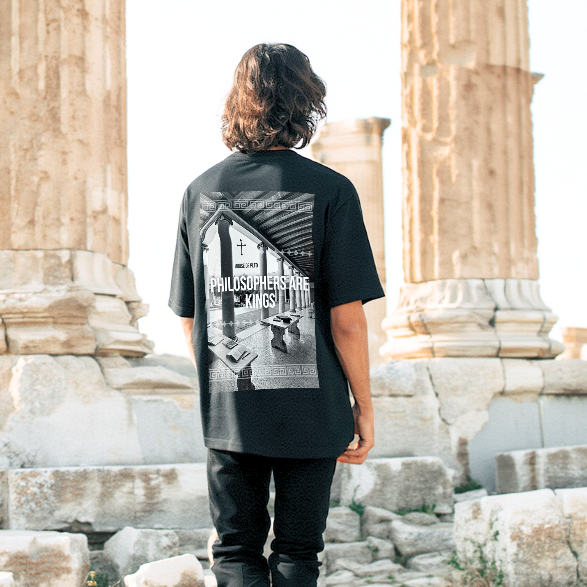 A minimal front crest marks the wearer with the philosophy of House of PLTO, while the reverse carries Philosophers Are Kings, framed in classical symmetry. A reminder that thought precedes action, and that mastery begins in the inner life.